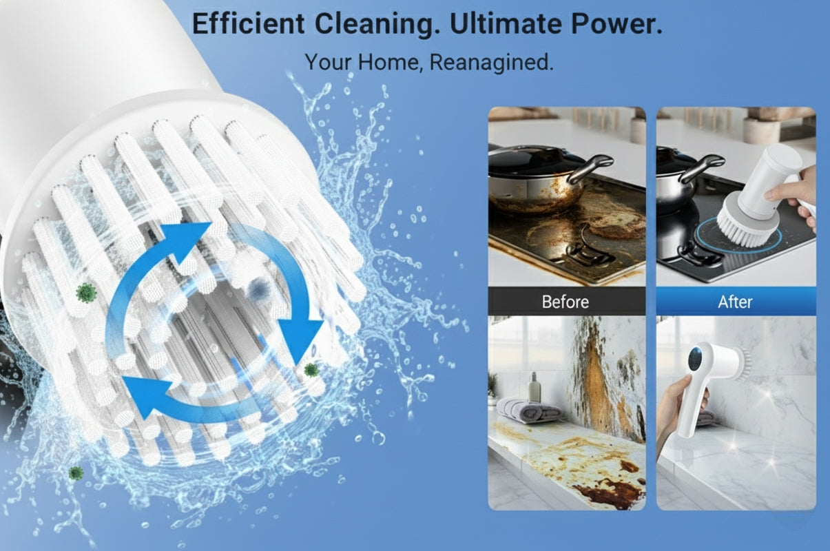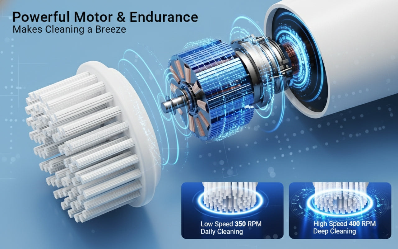 Effortless Power: High-speed spin technology cuts through grime, soap scum, and dirt in seconds.